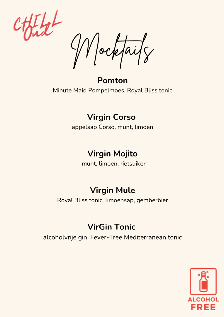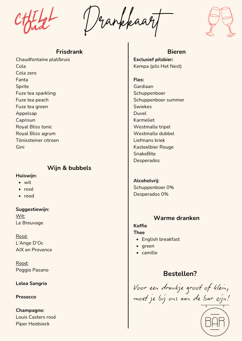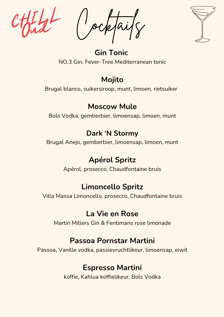 Neem alvast een kijkje in onze menukaart en laat je verrassen door ons aanbod aan verfrissende drankjes, smaakvolle fingerfood en zonnige klassiekers.